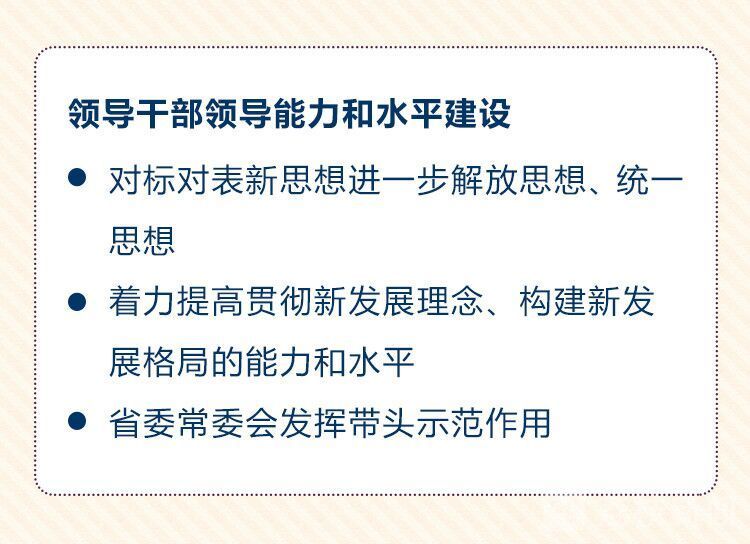 娄勤俭还对领导干部领导能力和水平建设再提出要求,一是要对标对表新思想进一步解放思想、统一思想;二是要着力提高贯彻新发展理念、构建新发展格局的能力和水平,对新发展阶段面临的新使命新任务加强研究、作出回答;三是省委常委会要发挥带头示范作用,常委同志要以身作则、以上率下,真抓实干、担当尽责,用实际行动担负起总书记赋予江苏的重大使命。