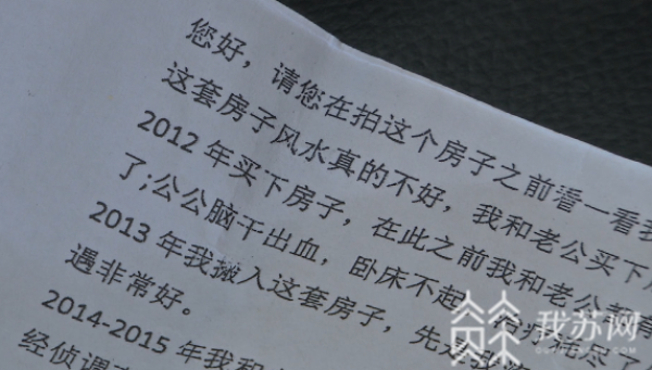 这次司法拍卖的房产位于南京浦口区天润城,原房主王某因触犯刑法,名下的这套房产拍卖所得将用于偿还受害人的损失。10月中旬,执行法官发布了拍卖信息,以市场价的7折110.34万起拍,共有11名意向购买人报名。很快,法院委托拍辅公司带着意向购买人看房。拍辅公司的工作人员张秋辰说,“我带大家进去的时候没有什么异常,出来的时候每个竞买人手上拿了一个小纸条,我拿来一看,写了风水不好,还有他们一家人买了房子以后发生好多不好的事”。
