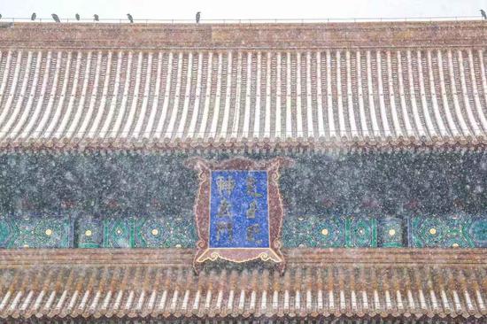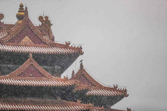 飘落在建筑物屋顶的白雪,在红墙的照应下,变成了一副绝美无比的水墨画。