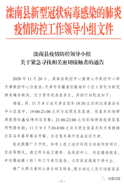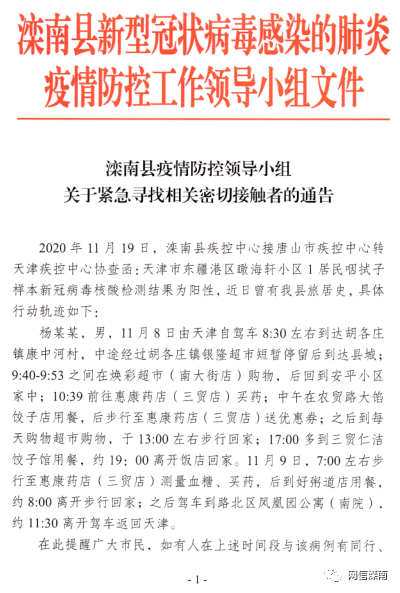 11月19日、20日,滦南县疾控中心连接唐山市疾控中心转天津疾控中心协查函,天津市东疆港区瞰海轩小区杨某某及其子杨某新冠肺炎病毒核酸监测结果均为阳性。杨某某及其子杨某于11月8-9日、杨某某于11月15-16日,有在我县旅居史。县防控办连续发出三个通告,紧急寻找相关密切接触者。