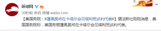 据法新社刚刚消息,美国国务院称,美国务卿蓬佩奥将在卡塔尔会见塔利班谈判代表。