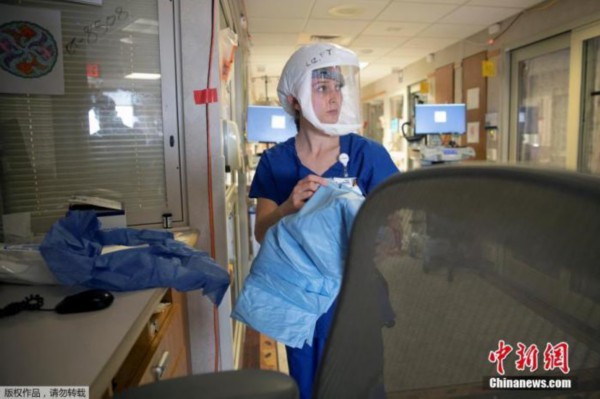当地时间11月18日,美国威斯康辛州麦迪逊华盛顿大学卫生大学医院,医护人员在进入新冠肺炎患者病房前,佩戴电动空气净化呼吸器。