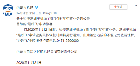 荔枝新闻讯 据内蒙古机场官博消息,21日,关于暂停满洲里机场全部“经呼飞”中转业务的公告发布,以下为全文:
