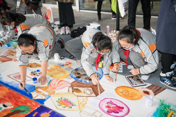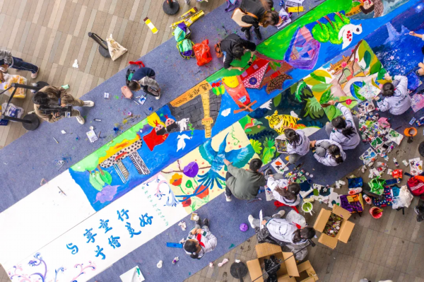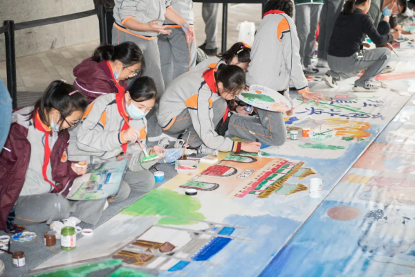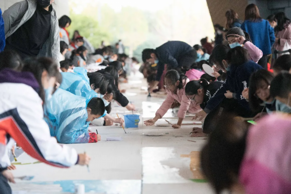 启动仪式上,百名青少年学生现场创作《大美南京》99米画卷。来自南师附中新城初级中学、科利华中学、钟英中学、力学小学海德北岸分校、建邺实验小学分校、紫竹苑小学的同学们手握画笔,或半蹲或半跪,挥洒泼墨,埋头作画。巧妙的构图,娴熟的画笔,无尽的创意,历时近2个小时,一幅幅色彩斑斓、童趣盎然的图画汇聚成99米长卷,承载着青少年对南京的美好愿景,在人们眼前徐徐展现。