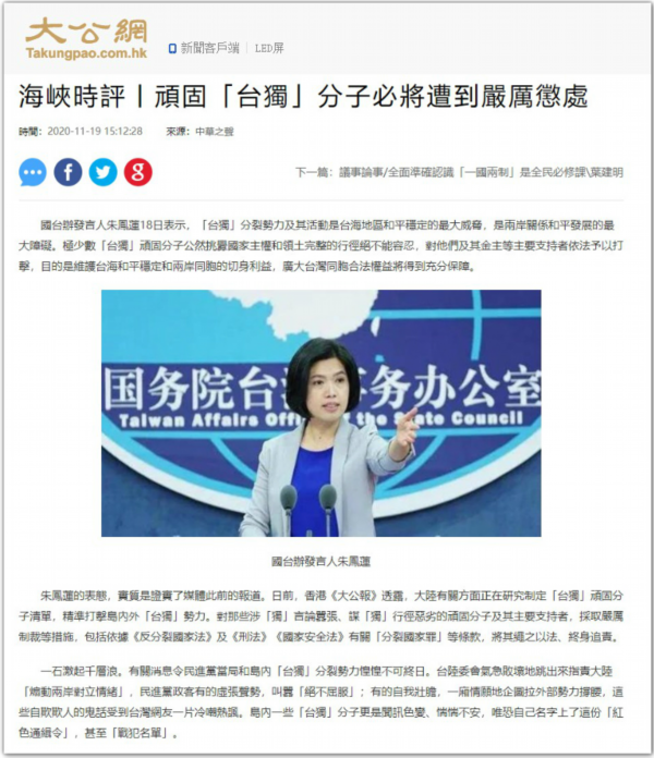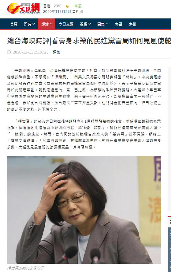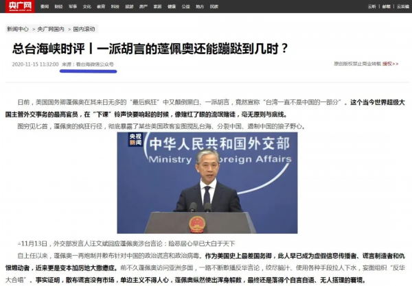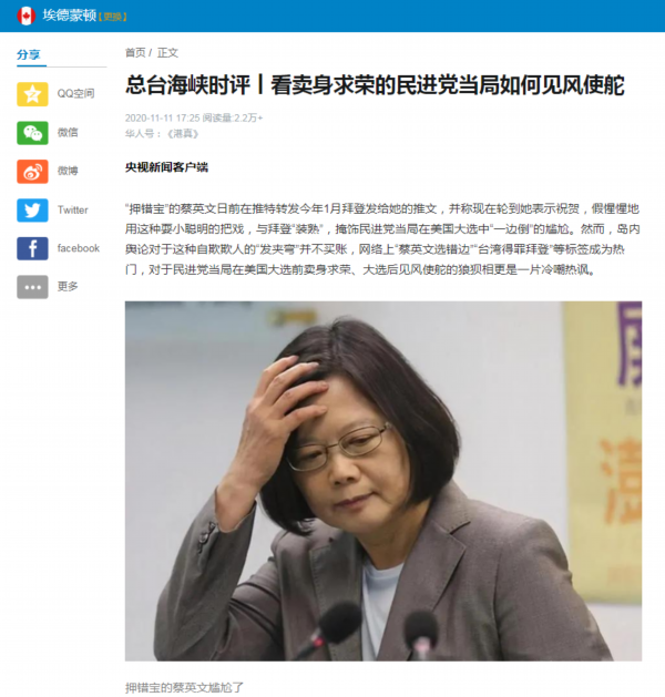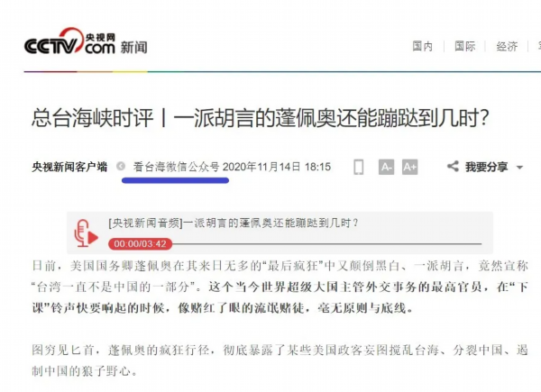 11月7日至11月19日,中央广播电视总台“看台海”新媒体平台连续发布《历史昭示未来 事实从未改变》《看卖身求荣的民进党当局如何见风使舵》《一派胡言的蓬佩奥还能蹦跶到几时?》《顽固“台独”分子必将遭到严厉惩处》等四篇“总台海峡时评”,重磅出击,给“台独”以极大震慑!系列评论充分揭露民进党当局见风使舵、卖身求荣的丑恶面目,有力批驳某些美国政客妄图搅乱台海、分裂中国、遏制中国的狼子野心。评论重申,大陆和台湾同属一个中国的事实从未改变,民族复兴、祖国统一,是包括台湾同胞在内的全体中华儿女的共同责任。严正警告一切“台独”分子,若执迷不悟、顽抗到底,必将受到两岸人民的共同谴责和法律的严厉惩处。