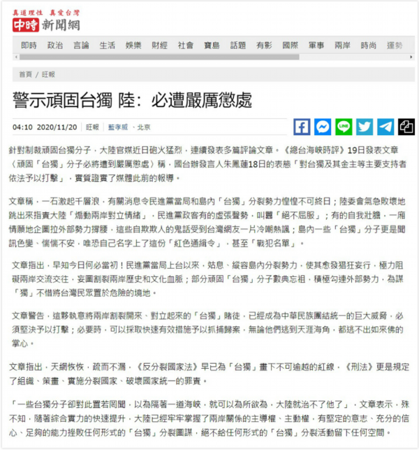 △台湾中时新闻网转载报道截图