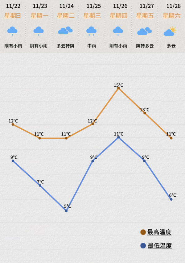 气温也将进一步缓降,渐渐迈向初冬。据泰州气象预报,未来三天依然阴冷当道,最高气温一直在11℃左右徘徊,最低气温节节下跌,24日早上最低气温只有5℃左右,大家一定要注意添衣保暖哦。