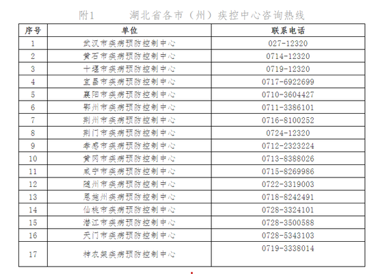 附1 湖北省各市(州)疾控中心咨询热线