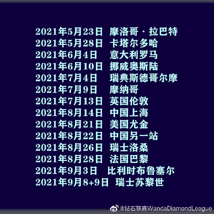 钻石联赛2021赛历。图片来源:世界田联钻石联赛官方微博