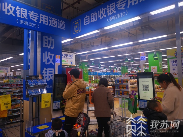 在智能化转型背景下,南京多家大型超市都推出了自助收银台,并增加了现场指导人员配置,对需要帮助的老年人专门指导。沃尔玛超市负责人表示,在购物高峰期,他们还会特地为老年人群体增开现金收费柜台。“固定开一个人工机台,对于年纪比较大,我们会协助他们把商品送到一楼。老年人对手机支付不熟悉,操作时间长,搞不清楚操作。如果人多我们会增加开放数量保证排队不超过五分钟。”南京沃尔玛超市迈皋桥店副总经理安开久说。