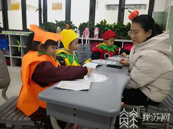 一年级的期中无纸化测试以“闯关”形式进行。教室被装扮成了五谷粮仓、开心菜园、水果农场,老师们将半学期来孩子们学习的知识设计成了一个个闯关游戏,孩子们穿上水果服装,展开知识的闯关,勇敢挑战的孩子获得一个个“丰收的果实”。