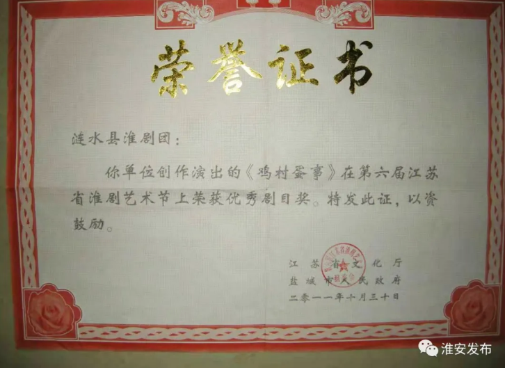 2010年创作演出的《鸡村蛋事》囊括了第六届江苏省淮剧节、第六届江苏省戏剧节优秀剧目等30项大奖,并获得2011-2012年度江苏省精神文明建设“五个一工程”奖。