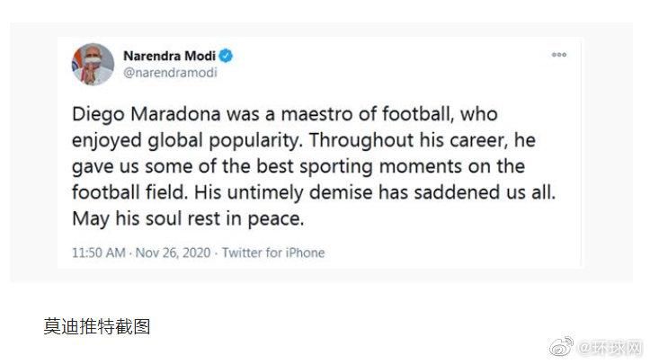 当天在推文中,莫迪写到:“迭戈•马拉多纳是享誉全球的足球大师。在他的职业生涯中,他为我们奉献了不少足球场上最精彩的运动瞬间。他的早逝让我们所有人都很难过。愿他的灵魂安息。”