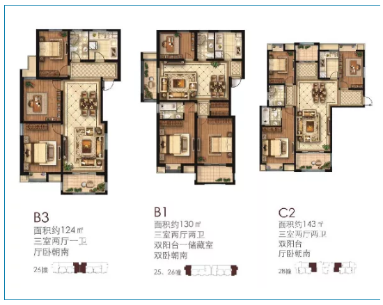 项目打造了建筑面积约124-143㎡的品质现房,124㎡户型分布于26号楼,130㎡户型分布于25、26、27号楼,143㎡户型分布于28号楼。