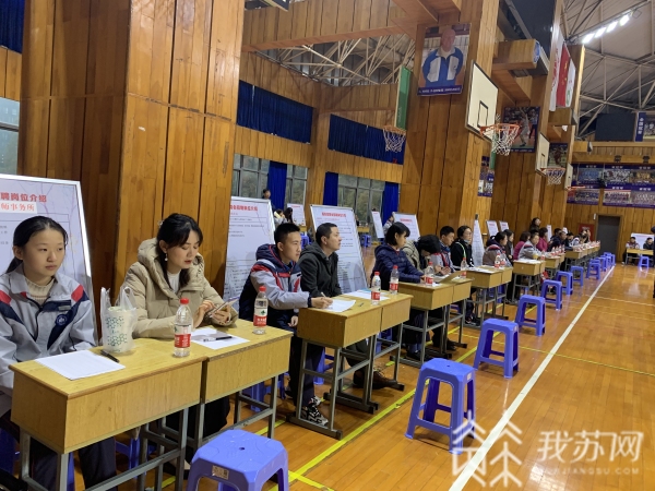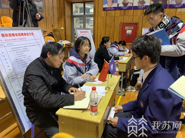 下午3点半,在南京金陵中学体育馆二楼,高二年级680多名学生正在进行模拟招聘。孩子们通过提前准备和了解,对自己感兴趣的岗位投递简历,并进行现场面试。现场共设置了60多个岗位,包含教育、金融、法律、管理等多个领域,而面试官都是在相关行业和公司工作的学生家长担任的。
