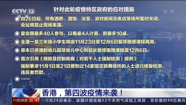 针对此轮疫情,地区政府从26日起酒吧等夜店暂时关闭,会址将禁止现场表演,另外有宴会有最多40人参与的限制,全港一到三年级的小学生停课两周,另外已经停课的幼儿园则延长停课一直到12月6日。
