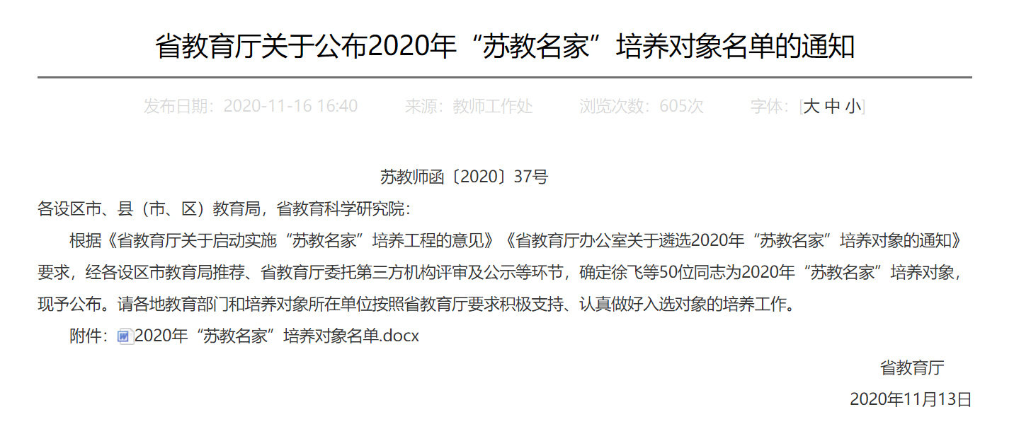 我苏网讯 近日,江苏省教育厅公布全省首批“苏教名家”培养对象名单,确定徐飞等50位同志为2020年“苏教名家”培养对象。