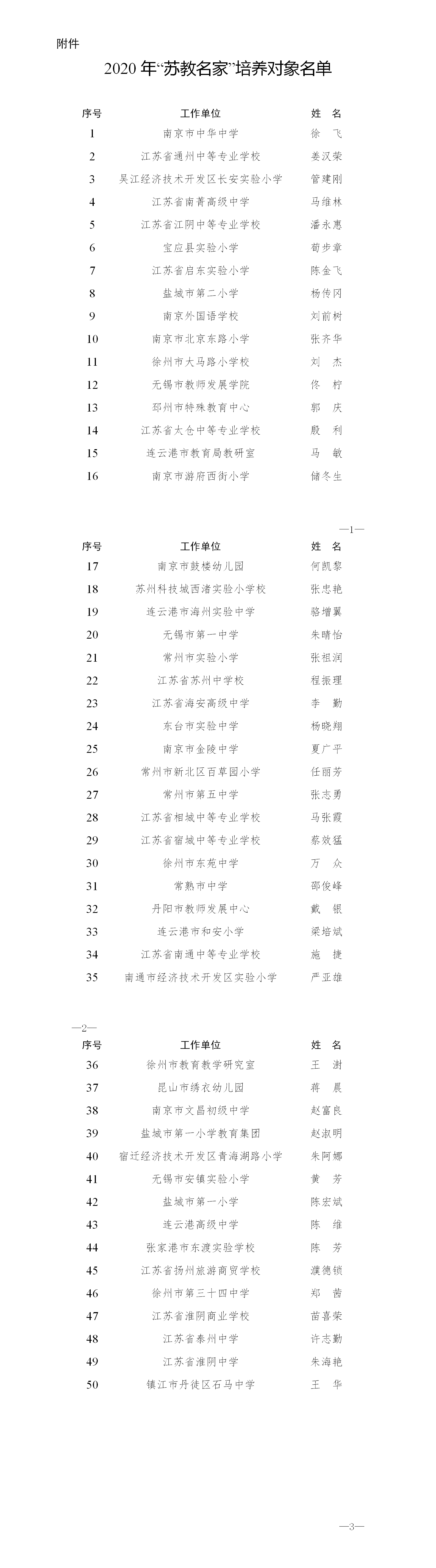 2020年“苏教名家”培养对象名单