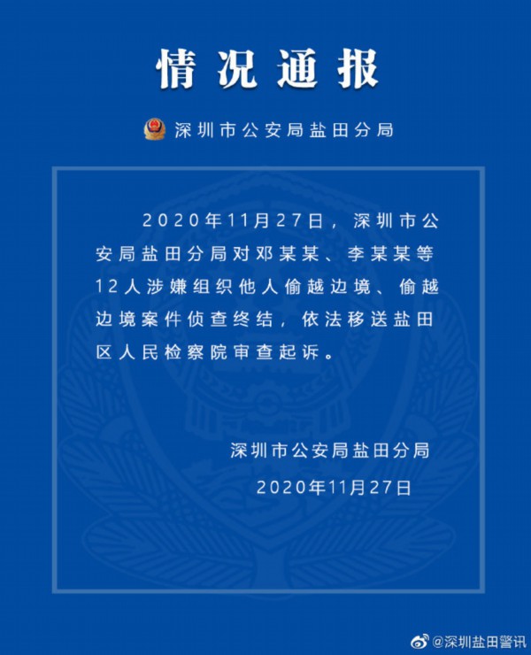 荔枝新闻讯 据@深圳盐田警讯11月27日,深圳市公安局盐田分局发布情况通报,邓某某、李某某等12人涉嫌组织他人偷越边境、偷越边境案已移送检方审查起诉。