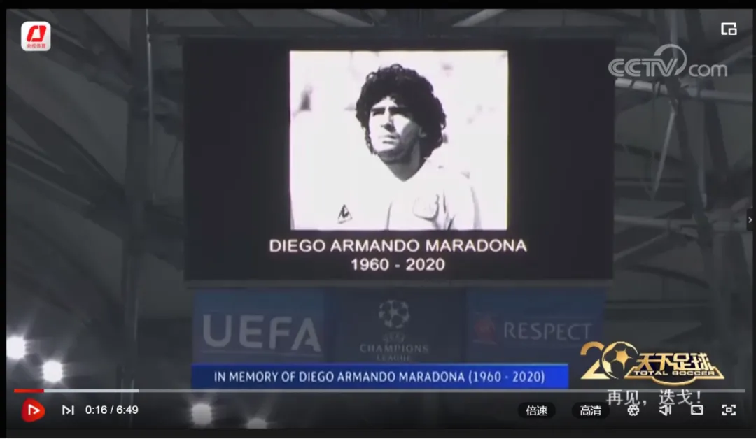 央视体育制作《天下足球》马拉多纳特辑,滚动播出;客户端推出“球王陨落”专题,以自身独有的、丰富的影像资料缅怀世纪球王。