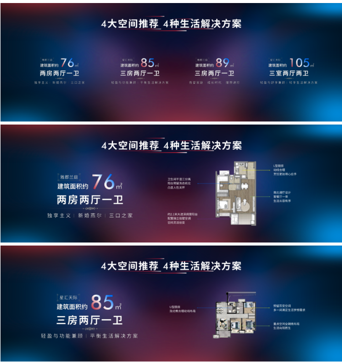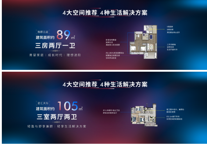 雅郡兰庭项目位于百家湖商圈、江宁大学城、麒麟科创园的中间区,同时毗邻南绕城高速和长深高速,可以说将成为整个城市东南片区,前景最好的人居腹地。 星汇天际项目位于南京向南的正轴线之上,在全国第13个临空经济示范区、南京第三座大学城(溧水大学城)的加持下,势必成为城市红利的新高地。 秉承雅居乐一贯以来的“大阳台主义”、“大客厅主义”的情况下,这两个项目创新的打造了兼容多类生活需求的“创变空间”,针对不同年龄层次,不同家庭结构打造出最符合时代理想的舒适居所。以下是我们的四大户型