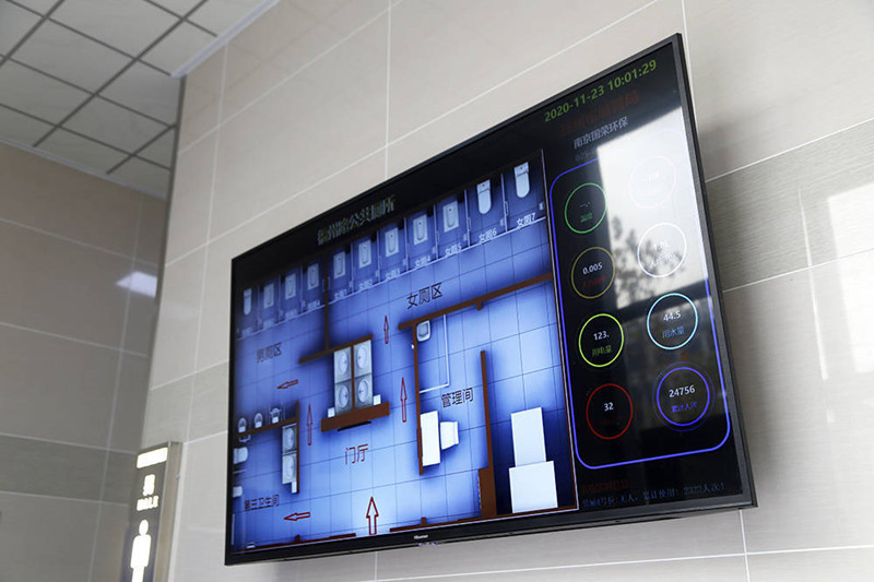 相较于普通公厕,位于福州路游园停车场内的一处公厕安装了智能设备。公厕内配备了无障碍通道和无障碍厕位,进入公厕大门,首先就能看到一面显示着厕所导引图的电子显示屏,上面不仅有温度、湿度、用电量、用水量等内容显示,还能给前来如厕的人提供指引。