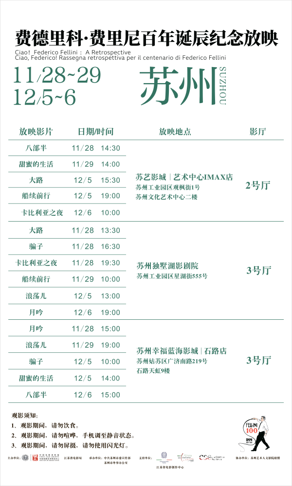 本次影展遴选了意大利电影大师费德里科·费里尼导演的8部经典影片,包括《八部半》《大路》《浪荡儿》《甜蜜的生活》《卡比利亚之夜》《月吟》《骗子》《船续前行》,将通过16个场次在两个周末进行放映,从本周开始分别在苏州艺术人文影院联盟的苏州幸福蓝海影城(石路店)、苏艺影城(艺术中心IMAX店)和独墅湖影剧院上映。