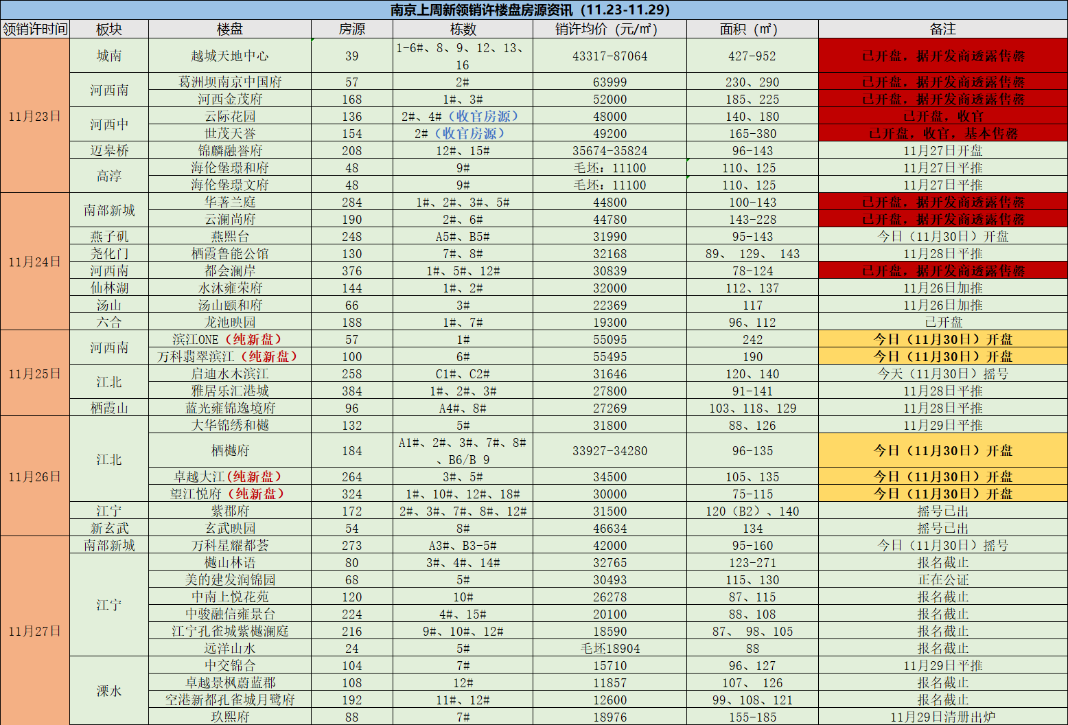 十一月的最后一周(11月23-11月29日),南京楼市迎来年末抢收潮,超6000套房源上市,涉及多个板块,因此从上周一直延续到本周,楼市都陷入了报名、摇号、开盘的流程中,仅周末一天,就有6家楼盘进行公证摇号,今天更有多家项目同时开盘,具体情况如下:
