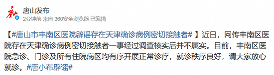 荔枝新闻讯 据@唐山发布 微博消息,近日,网传丰南区医院存在天津确诊病例密切接触者一事经过调查核实后并不属实。目前,丰南区医院急诊、门诊及所有住院病区均有序开展正常诊疗,就诊秩序良好,请大家放心就诊。
