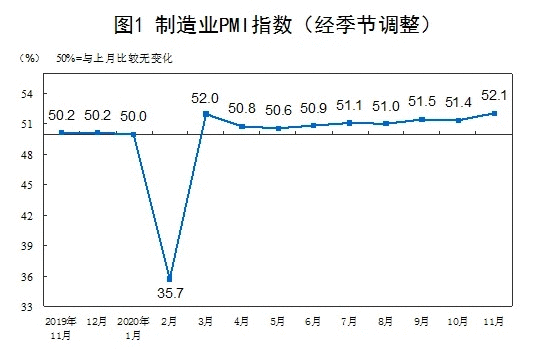 市场经济活动中,企业信心直接影响着经济活力。国家统计局今日公布的数据显示,11月份,中国制造业采购经理指数、非制造业商务活动指数和综合PMI产出指数分别为52.1%、56.4%和55.7%,高于上月0.7、0.2和0.4个百分点,三大指数均位于年内最高点,连续9个月高于临界点。