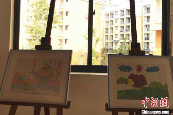 图为会泽县城易地扶贫搬迁点一所小学内摆放着的学生画作。 缪超 摄