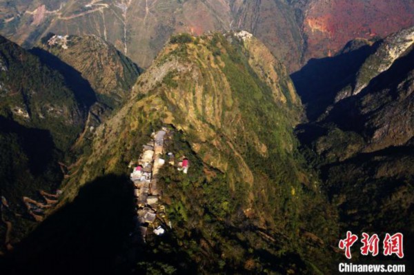 图为航拍会泽县老鹰岩:一块突出的三角岩壁,背靠大山,两侧是悬崖。中共会泽县委宣传部供图