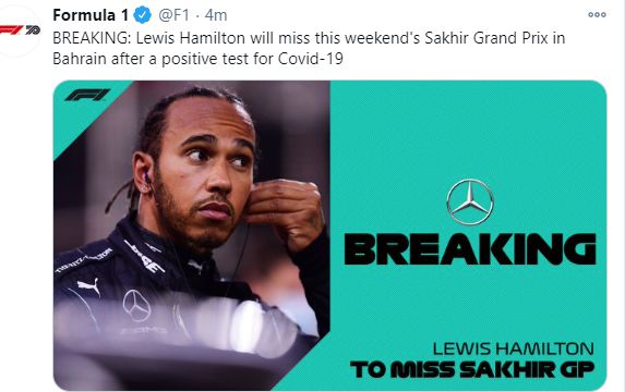 梅赛德斯车队表示:“很遗憾宣布,汉密尔顿的新冠检测呈阳性,将无缘参加本周末的萨基尔大奖赛。汉密尔顿上周接受三次检测,每次都是阴性,在上周日下午的巴林国家赛车场检测也是阴性。然而本周一早上醒来时汉密尔顿有轻微症状,同时我们得知,他在抵达巴林前的一位密切接触者也是阳性,对汉密尔顿再次检测,得到了阳性的结果。汉密尔顿目前被隔离,除了有轻微症状,其他方面都很健康,全队祝他早日康复。”