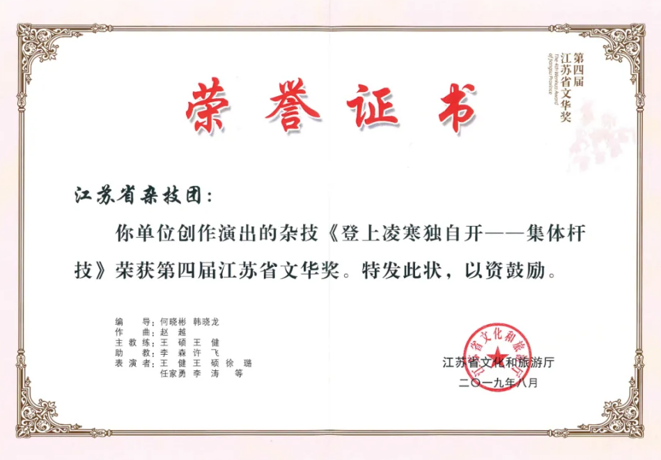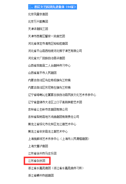 11月26日,中央宣传部办公厅、文化和旅游部办公厅、国家广播电视总局办公厅发布《关于表彰第八届全国服务农民、服务基层文化建设先进集体的决定》,江苏省杂技团荣获“全国基层文艺院团先进集体”!