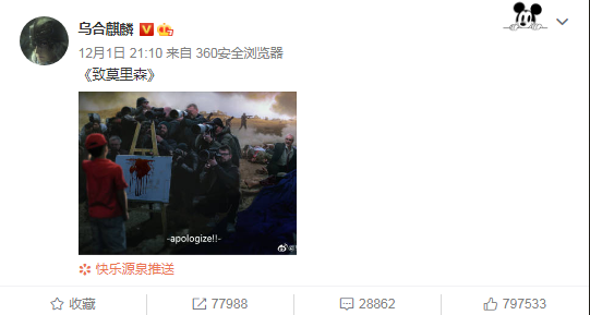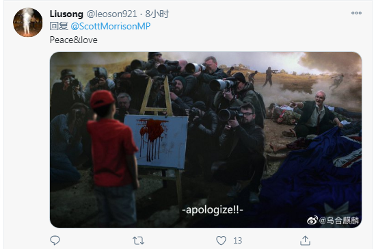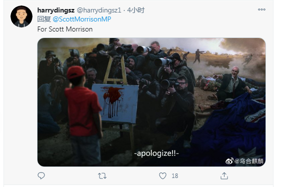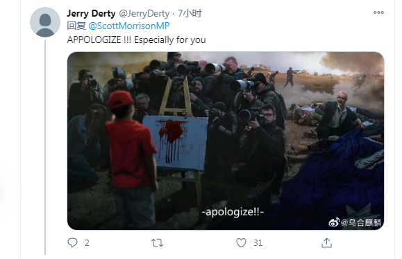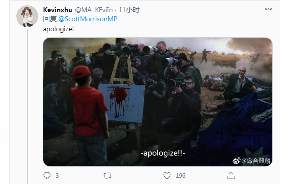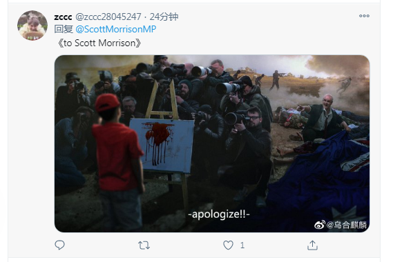12月1日晚间,中国青年漫画家“乌合麒麟”发布新作《致莫里森》。很快,这张图多次出现在了澳大利亚总理莫里森最新的推特评论下,有网友留言说,“你要的道歉”。此前,莫里森因中国外交部发言人赵立坚在推特发布“乌合麒麟”另一张描述“澳士兵残杀少年”的漫画,而要求中国政府道歉。