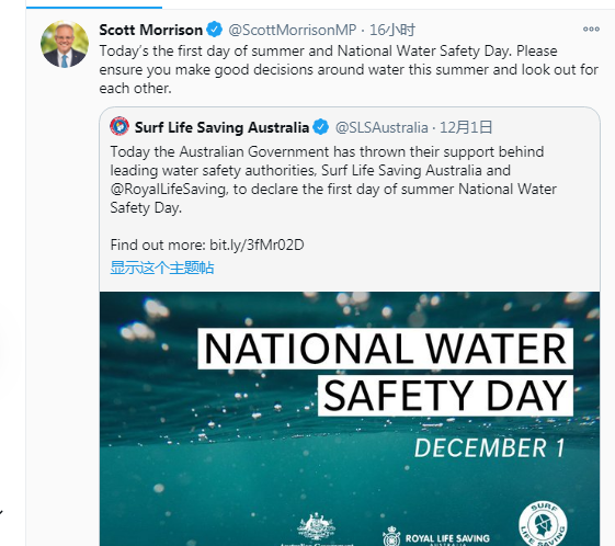 莫里森最新的推文发布于北京时间12月1日下午4时许。他转发了澳大利亚冲浪救生组织(SLSA)官方推特发布的一条推文,并转评称:“今天是夏季的第一天,也是国家水安全日。今年夏天,请确保你们在有关水的问题上做出正确决定,并互相照顾。”
