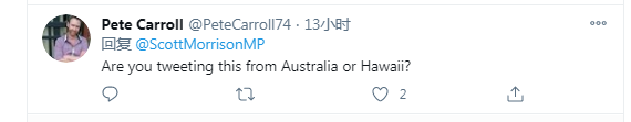当然在莫里森的这条推文下,也有网友回复与其推文内容有关的评论。有网友回忆起去年12月澳大利亚发生山林大火时,莫里森却前往美国夏威夷度假一事。