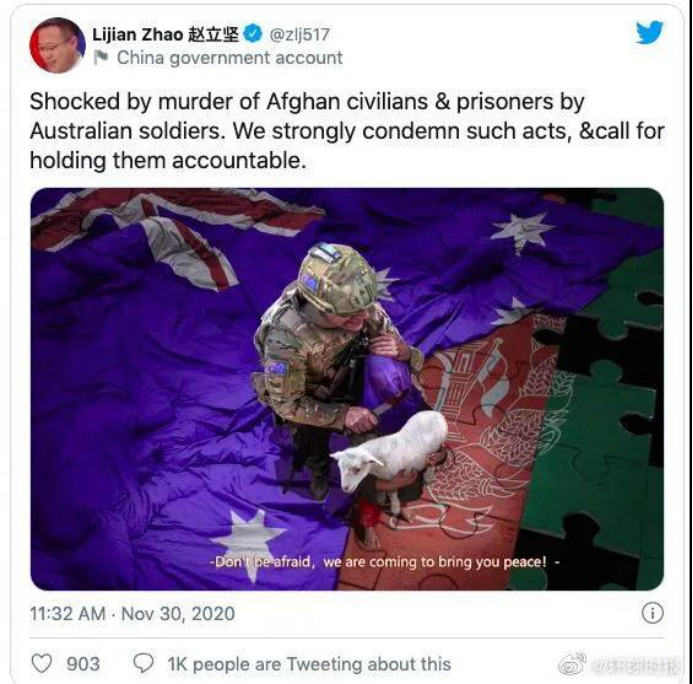 在11月30日下午举行的中国外交部例行记者会上,发言人华春莹也曾围绕该事件作出回应。有记者提问说,澳大利亚总理莫里森要求中方就外交部发言人赵立坚在推特发布澳军队残杀阿富汗儿童的漫画道歉,称这是“伪造的”的,中国应该为此“感到耻辱(feel ashamed)”。