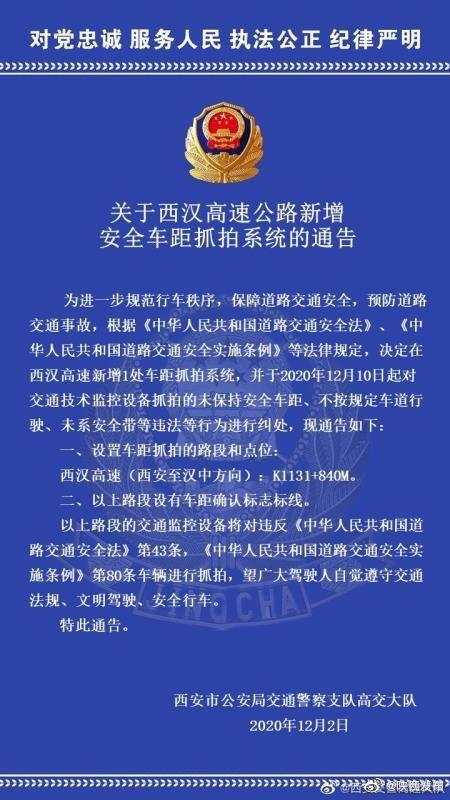据西安交警高速大队消息,西汉高速西安往汉中方向k1131➕840m处新增车距抓拍系统。系统由卡口相机、全景相机等组成,针对正常通行情况下的未保持安全车距抓拍。按照相关法律规定,高速路上正常行驶时最小车距不低于50米。12月10日起,系统将正式启用抓拍,未保持安全车距将处以200元以内罚款。设置安全车距抓拍系统的西汉高速K1130至K1150路段,在上半年公安部交管局公布的全国事故多发路段排名第二。其中,未保持安全车距是追尾类事故发生的重要原因。