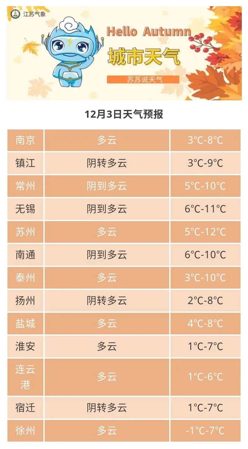 2号夜里,沿江和苏南地区还会出现零星的小雨。3号全省都是多云天气,偏北风4到5级阵风6级。受到新一股冷空气的影响,气温将全面下滑,江苏大部分地区的最低气温将在48小时内下滑6℃左右。