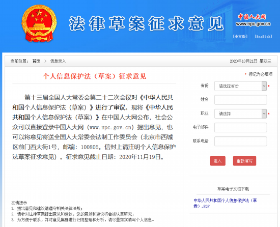 今年10月首次亮相的《个人信息保护法(草案)》中,规定了个人在个人信息处理活动中的权利,即个人对其个人信息的处理享有知情权、决定权,有权限制或者拒绝他人对其个人信息进行处理。