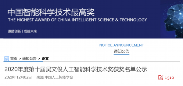 2020年度第十届吴文俊人工智能科学技术奖获奖名单公示啦!