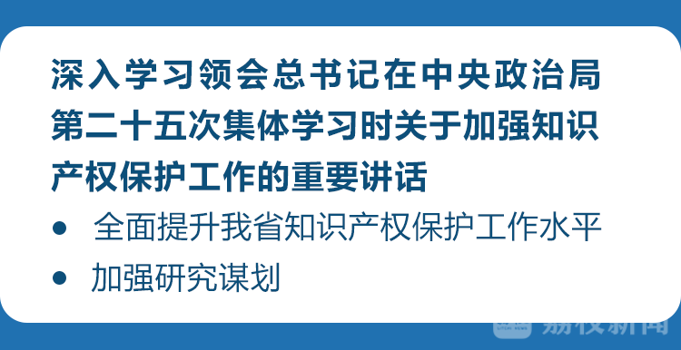 会议强调,要深入学习领会总书记在中央政治局第二十五次集体学习时关于加强知识产权保护工作的重要讲话,从国家战略高度和进入新发展阶段要求出发,全面提升我省知识产权保护工作水平,促进建设现代化经济体系、激发全社会创新活力、服务全国构建新发展格局。要加强研究谋划,切实把总书记重要讲话精神贯彻落实到“十四五”发展和科技工作的各个方面。