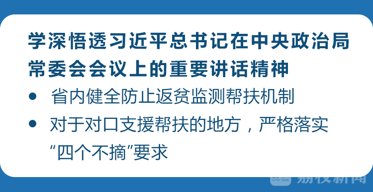 会议指出,要学深悟透习近平总书记在中央政治局常委会会议上的重要讲话精神,充分认识党的领导和我国社会主义制度的政治优势,充分认识新时代脱贫攻坚取得的重大胜利,认真总结评估我省脱贫攻坚的创新举措、重要成果和宝贵精神财富。省内要健全防止返贫监测帮扶机制,及时发现,及时帮扶,动态清零,特别是着眼于解决不平衡不充分的问题,坚持“四化”同步发展,提高区域均衡发展水平,让人民群众逐步提高生活品质。对于对口支援帮扶的地方,要严格落实“四个不摘”要求,多措并举帮助当地巩固拓展脱贫攻坚成果。
