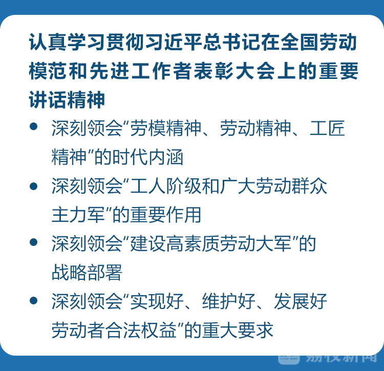 会议指出,要认真学习贯彻习近平总书记在全国劳动模范和先进工作者表彰大会上的重要讲话精神,深刻领会“劳模精神、劳动精神、工匠精神”的时代内涵,全面贯彻尊重劳动、尊重知识、尊重人才、尊重创造方针,推动形成崇尚劳动、见贤思齐的社会风尚。要深刻领会“工人阶级和广大劳动群众主力军”的重要作用,持续加强思想政治引领,广泛开展劳动和技能竞赛,激励广大劳动者积极投身“争当表率、争做示范、走在前列”的时代征程。要深刻领会“建设高素质劳动大军”的战略部署,把提高劳动者素质作为基础性、先导性工程,加快打造一支高素质劳动者大军。要深刻领会“实现好、维护好、发展好劳动者合法权益”的重大要求,推动构建和谐劳动关系,让改革发展成果更多惠及广大劳动者。