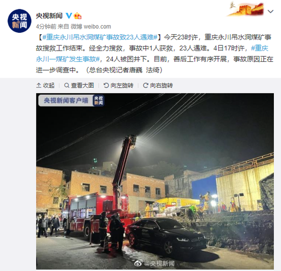 今天23时许,重庆永川吊水洞煤矿事故搜救工作结束。经全力搜救,事故中1人获救,23人遇难。4日17时许,重庆永川一煤矿发生事故,24人被困井下。目前,善后工作有序开展,事故原因正在进一步调查中。
