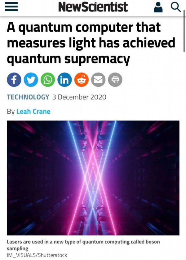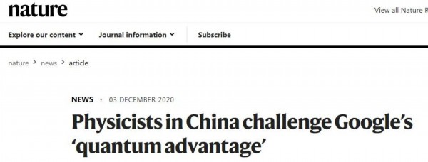 《自然》杂志发表题为《中国物理学家挑战谷歌“量子优越性”》的报道说,中国科学家使用激光束进行了一项数学上被证明在普通计算机上几乎不可能完成的计算。“该团队在几分钟内就完成了现有最好的超级计算机需要地球一半年龄才能完成的任务”,且与谷歌去年发布的53个超导比特量子计算原型机的硬件路径不同。
