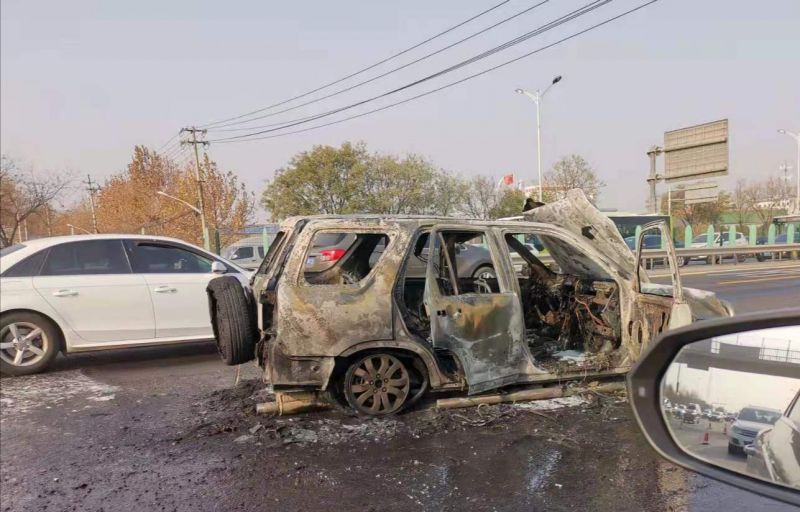 记者看到有网友拍到的现场视频,一辆带有备胎的机动车正被大火吞噬,而在对面的出京方向,消防车鸣着警笛已经赶到,正准备实施扑救,车辆行经事发现场时均纷纷躲避。