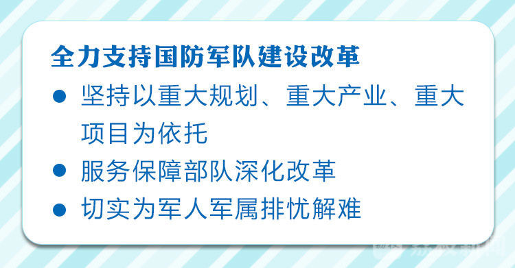 会议指出,要全力支持国防军队建设改革。要坚持以重大规划、重大产业、重大项目为依托,找准国家军事战略与我省现代产业体系建设、基础设施建设、区域协调发展的结合点,加快重点领域“军转民”“民参军”步伐。要服务保障部队深化改革,及时研究解决涉及地方的重大事项。要切实为军人军属排忧解难,深入开展双拥创建,完善落实拥军优属各项政策,扎实做好退役军人就业安置、服务保障、权益维护等工作。
