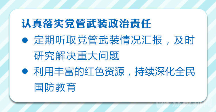 会议强调,要认真落实党管武装政治责任。全省各级党委要定期听取党管武装情况汇报,及时研究解决重大问题,严格执行党委议军、武委会例会、第一书记述职等制度,把抓武装的责任意识转化为强国防的具体行动,把党的政治优势组织优势转化为国防动员制胜优势。要利用我省丰富的红色资源,持续深化全民国防教育,营造崇军尚武浓厚氛围,凝聚强国兴军磅礴力量。